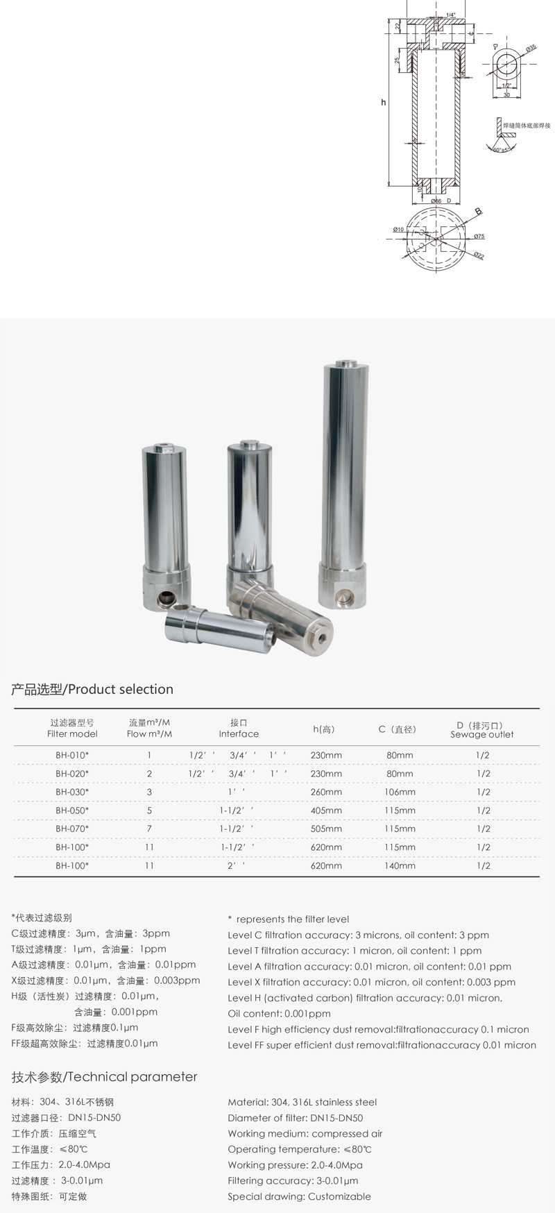 適用于濾去4.0Mpa以下的壓縮空氣的固態和液態雜質,高壓氣體精密過濾器采用精密度制造工藝,充分考慮了高壓技術的要求。由高等級304、316L不銹鋼制成可提供25、5 、1和0.01um及活性炭過濾等級性能濾芯,滿足客戶各種特殊要求,應用空氣動力學原理進行設計,確保將過濾介質壓降降到最低。